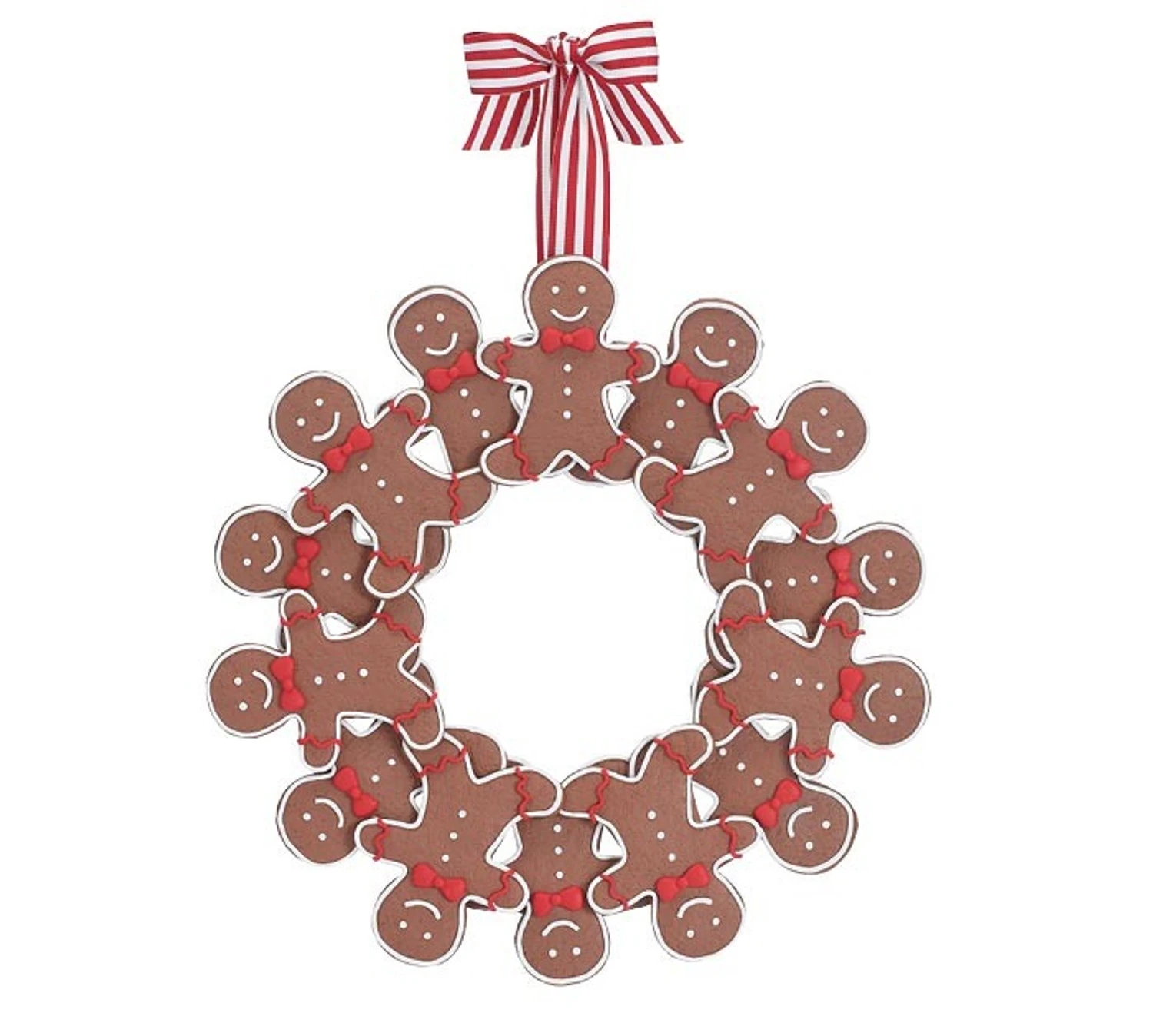 Sweeten up your Christmas decor with this cute wreath! It features gingerbread men layered on top of one another to create a circle. Each cookie has a small red bow and white icing accents! The wreath is suspended from a red and white ribbon and bow! Made of claydough. Dimensions: 18″ H x 18″ W x 1/2″ D. 23″ hanging from the ribbon. Item #: 9742089