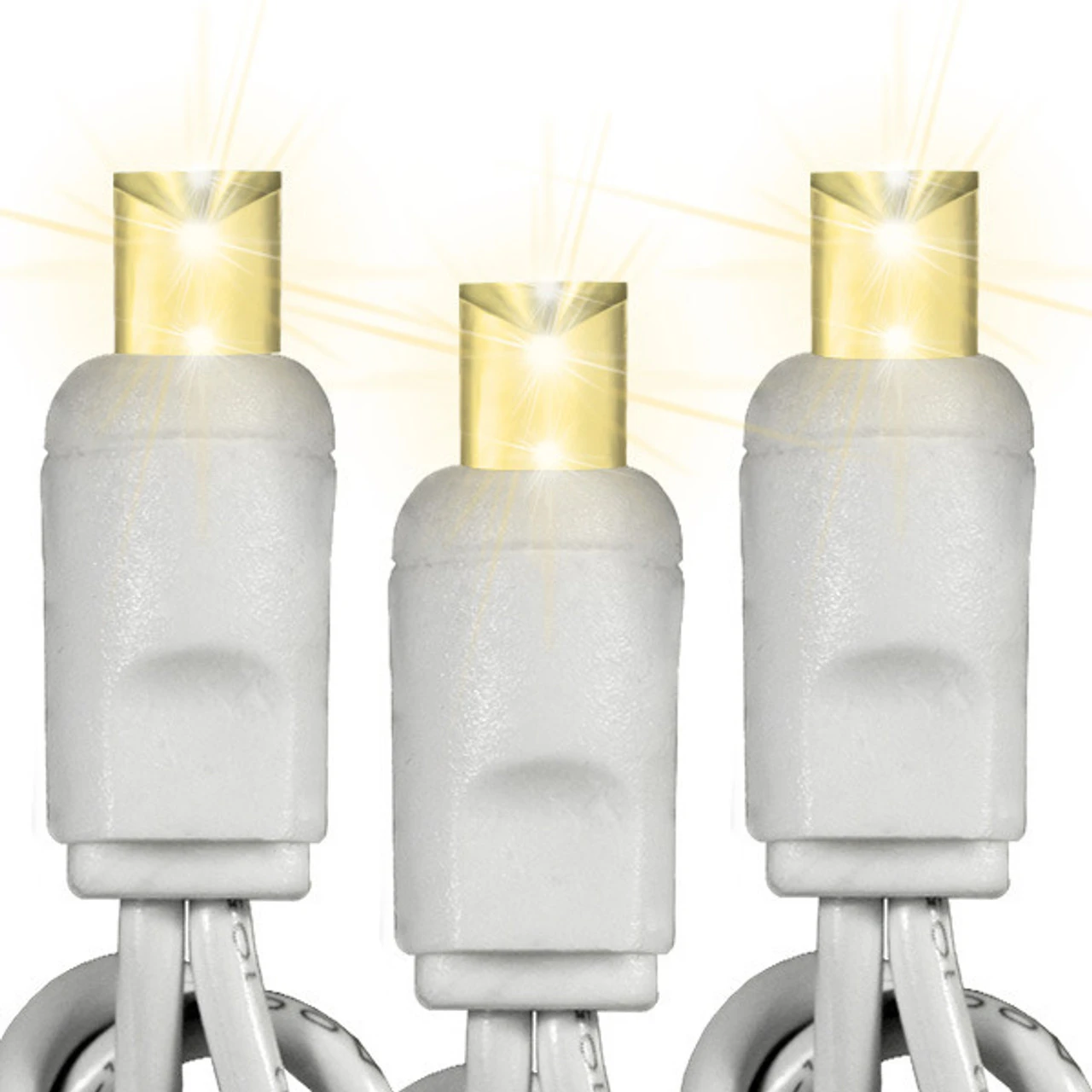 This season make your holiday lighting eye catching with warm white wide angle LED mini Christmas lights. 50 bulbs are spaced 6 inches apart on 25.8-feet of white wire, making the string ideal to decorate Christmas trees, interior trim, and fence lines. UL listed for indoor/outdoor use, 60 sets can safely be combined end-to-end. The three-season warranty covers use for 30 days for each of three holiday seasons. Cool to the touch and energy efficient, these patented wide angle LEDs are equally brilliant from any viewing angle.