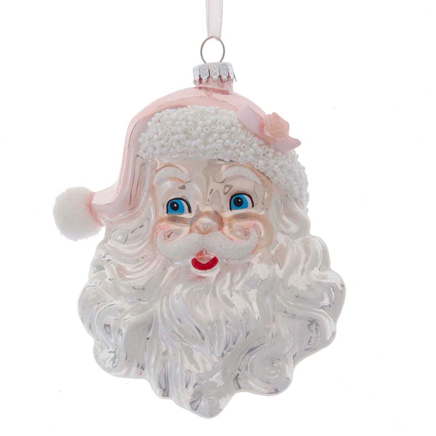 This adorable little Santa features blushing cheeks and a pretty pink hat with pearl trim and a small pink rose! Made by Kurt Adler. Made of glass. Dimensions: 6″. Item #: T2802