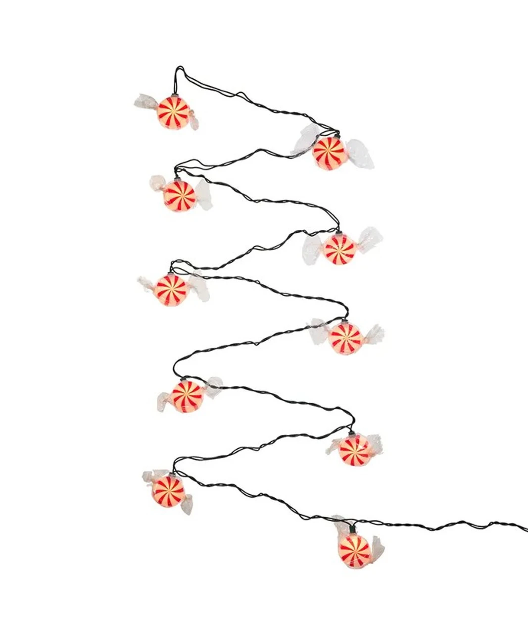 This Kurt Adler red peppermint candy light set is a classic, festive way to add to the lighting of your holiday décor. Each of the 10 lights in this novelty light set resembles a plastic-wrapped red and white round peppermint candy, adding a sweet touch to your decor. Each artificial candy (wrapper included) measures about 4.5-inches in width, 2-inches in height, and 1.75-inches in depth.
