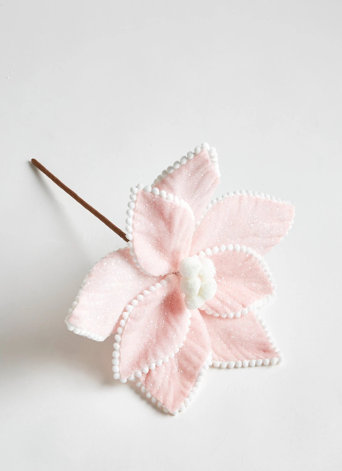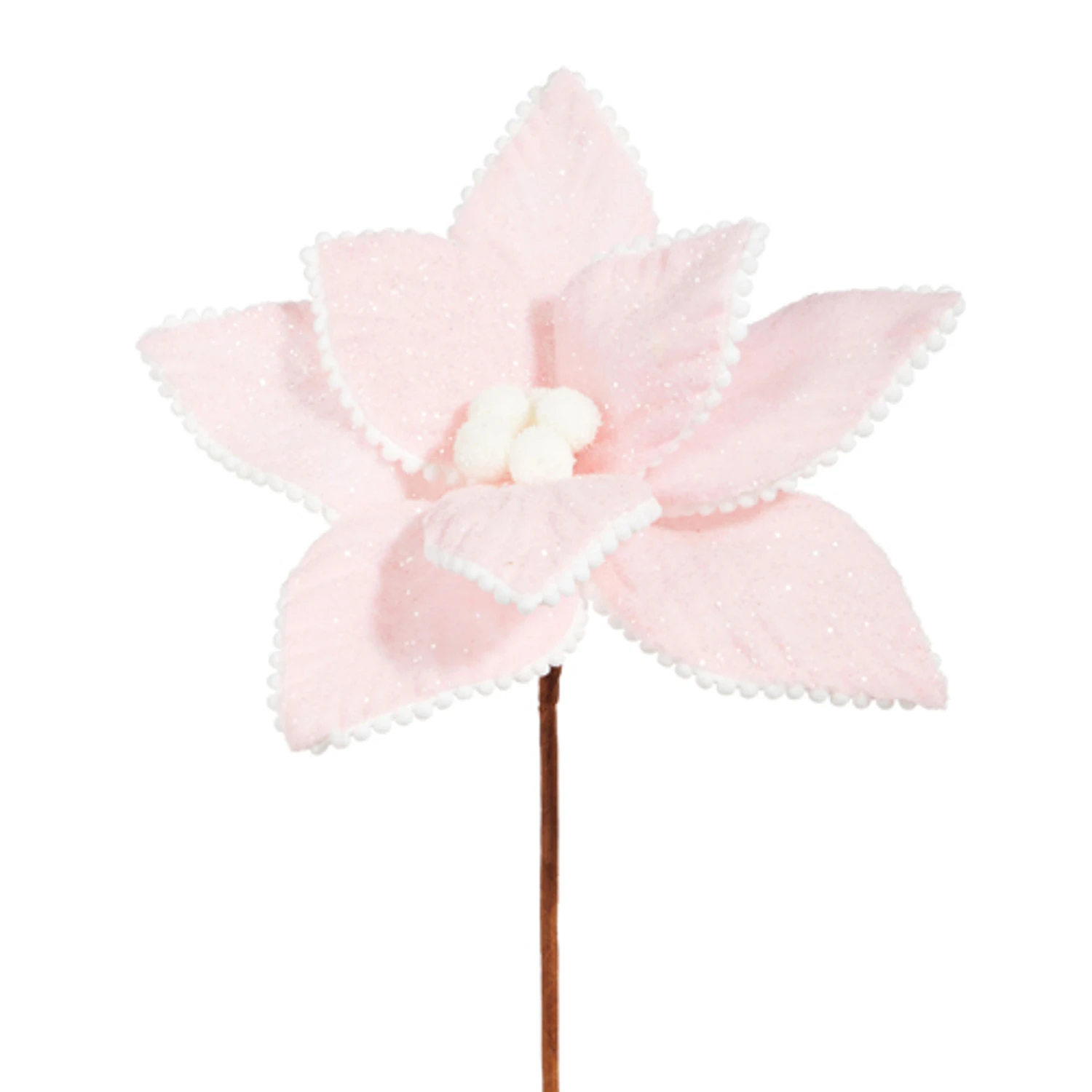 Poinsettias are perfect to poke throughout your Christmas tree this year! This one is made of light pink felt and dusted with sparkling glitter and trimmed in tiny white pom poms! Made by Raz Imports. Made of polyester. Dimensions: 13″. Item #: F4306675