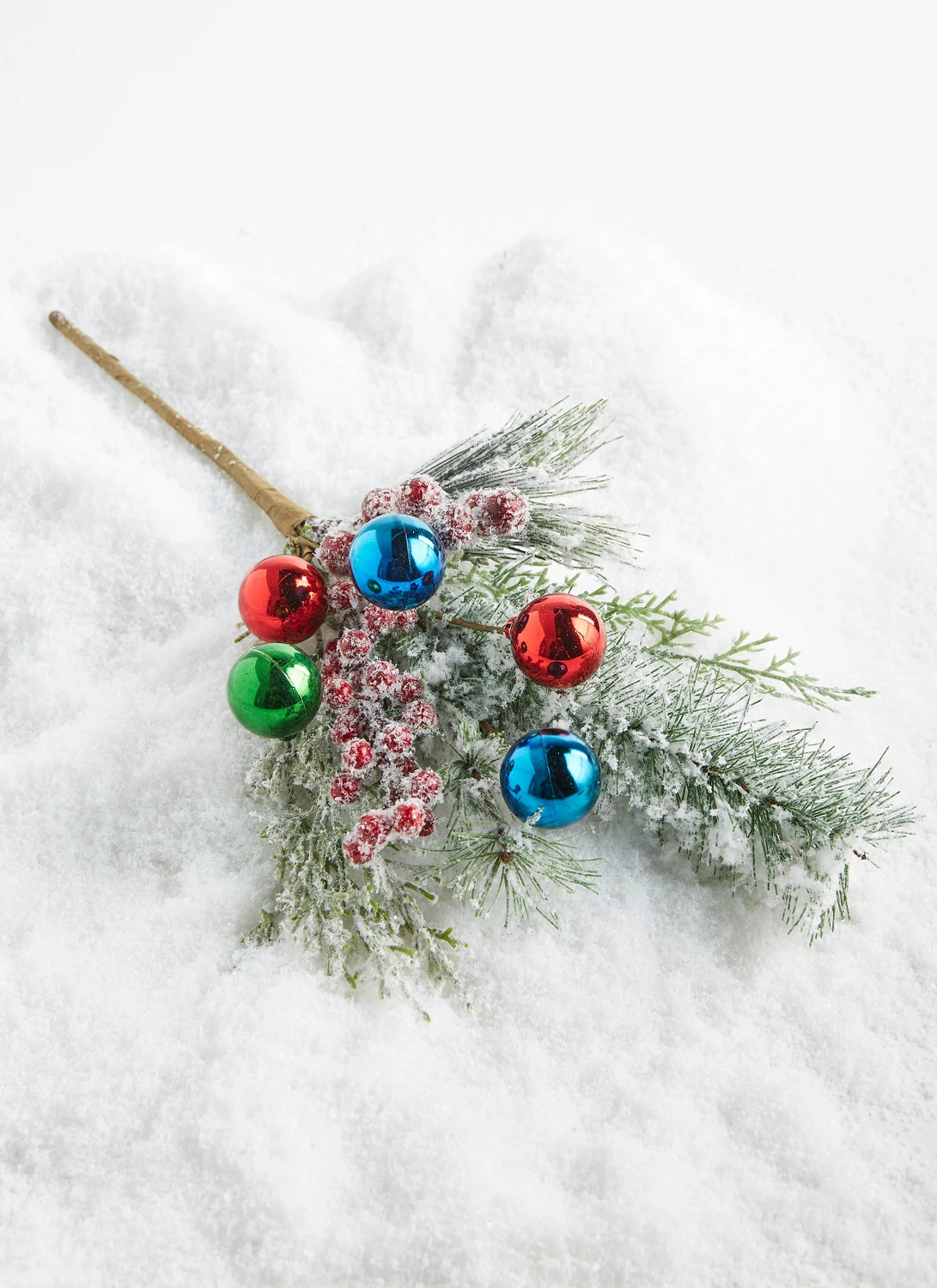 This pick has it all! It features snow dusted pine branches, icy red berry bundles, and shimmering red, blue and green ball ornaments! Made by Raz Imports. Made of plastic and polyester. Dimensions: 16″. Item #: F4306722