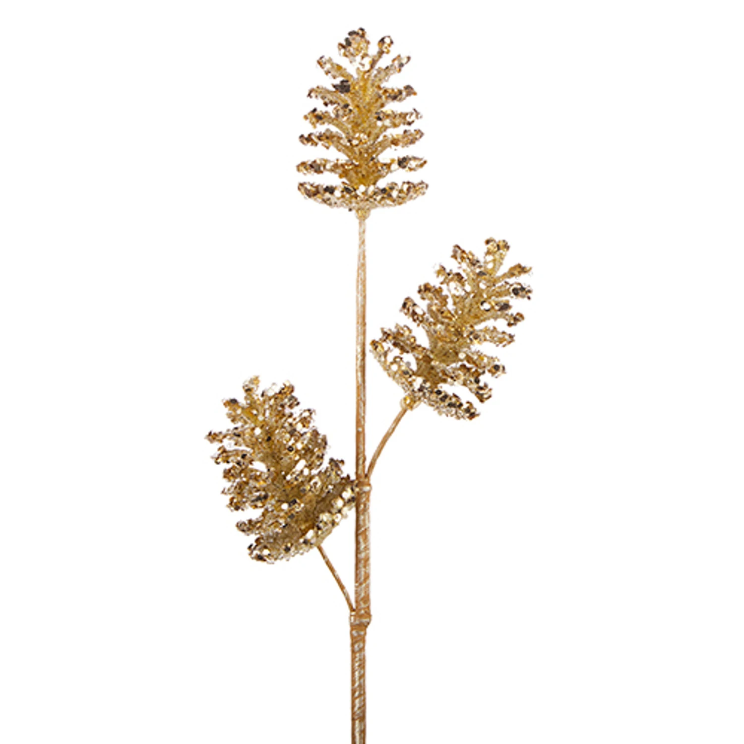Do you love sparkle and love the woodsy look? This spray is perfect for you! It features three gold pinecones coated in glitter, beading, and sequins! Made by Raz Imports. Made of plastic. Dimensions: 19.25″. Item #: F4206704