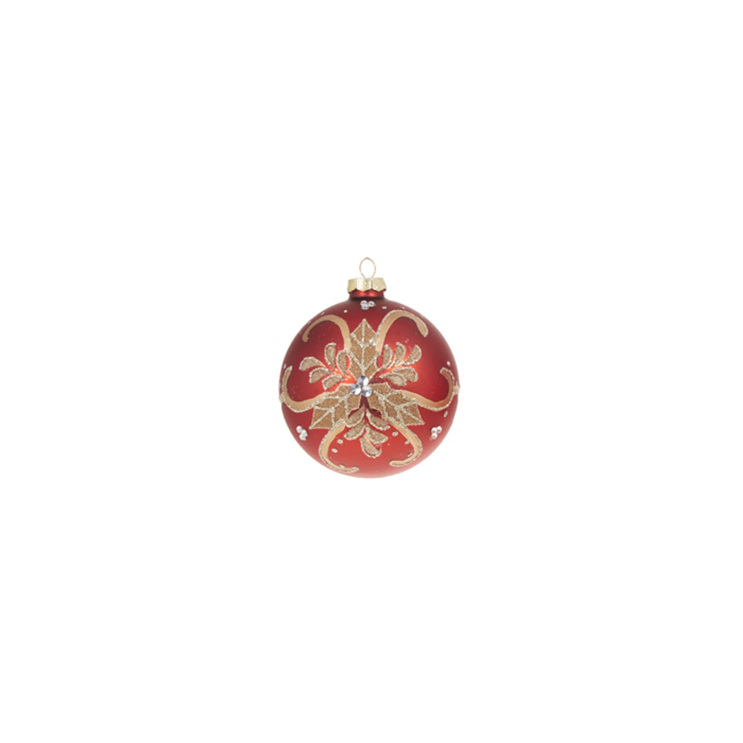 Decorate your tree with these pretty red ornaments! Each one features a matte red glass decorated with gold holly leaves covered in gold glitter, and gold ticks and silvery jewels! Each sold individually OR as a set! Made by Raz Imports. Made of glass. Dimensions: 4″. Item #: 4322839
