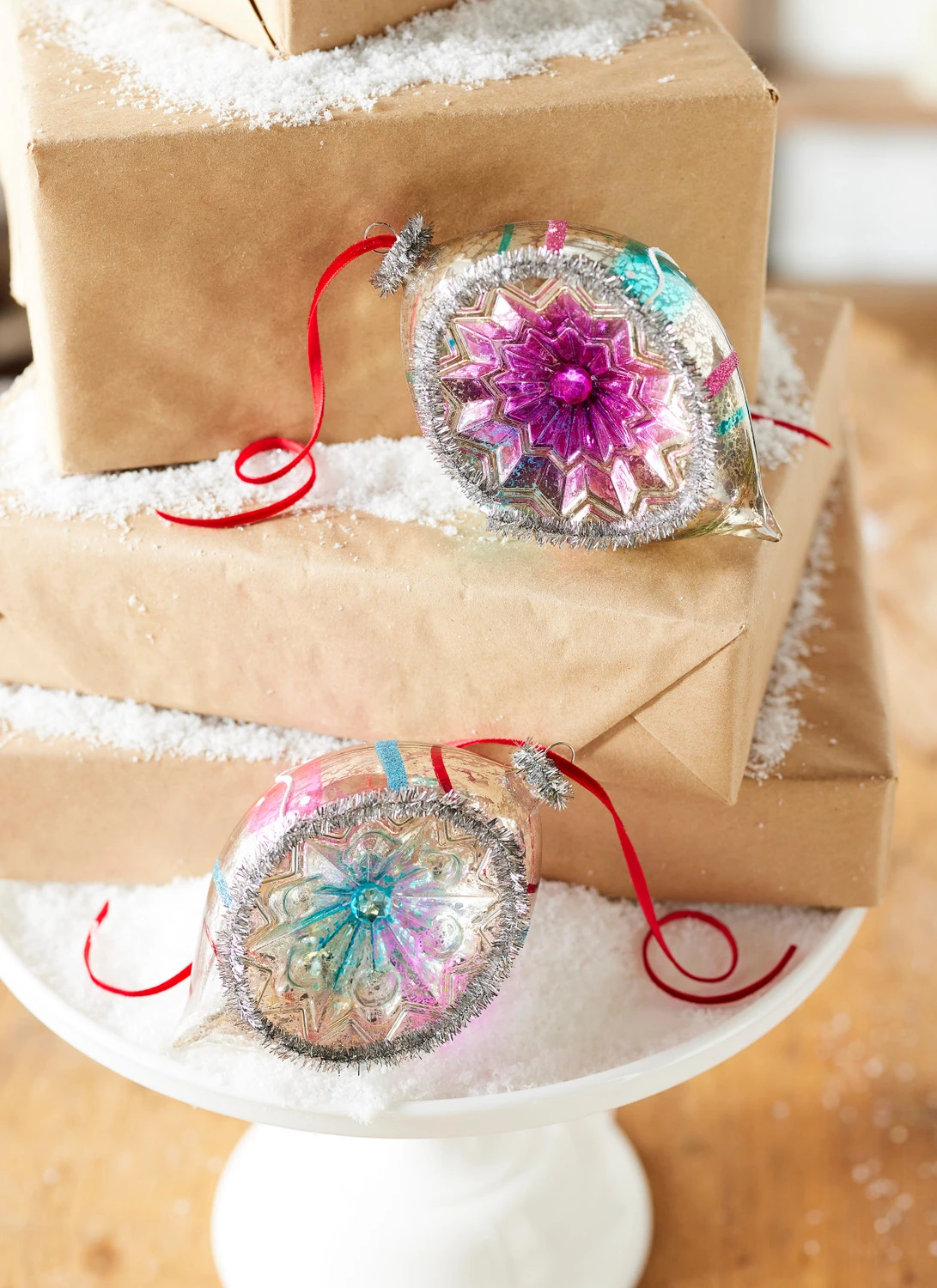 Add a bright pop of color with these gorgeous ornaments! Each one is made with silver mercury glass with purple and blue stripes, silver tinsel, and a jeweled reflector! Each sold individually OR as a set of 2. Made by Raz Imports. Made of glass and plastic. Dimensions: 3.5″D X 5.5″H. Item #: 4352881