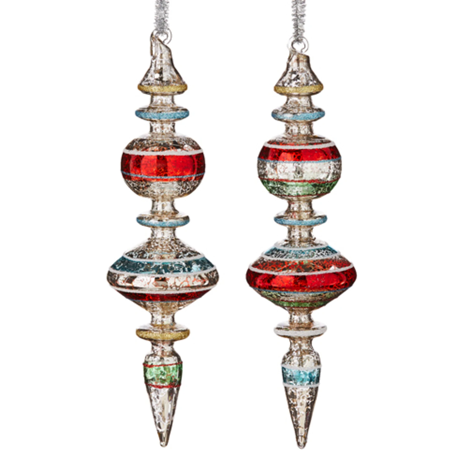 These stunning ornaments feature a mercury glass look and colorful stripes of red, blue, green, and gold! They are perfect to hang along the branches of your tree or dot along your favorite garland! Each sold individually. Made by Raz Imports. Made of glass. Dimensions: 9.75″ tall. Item #: 4124510