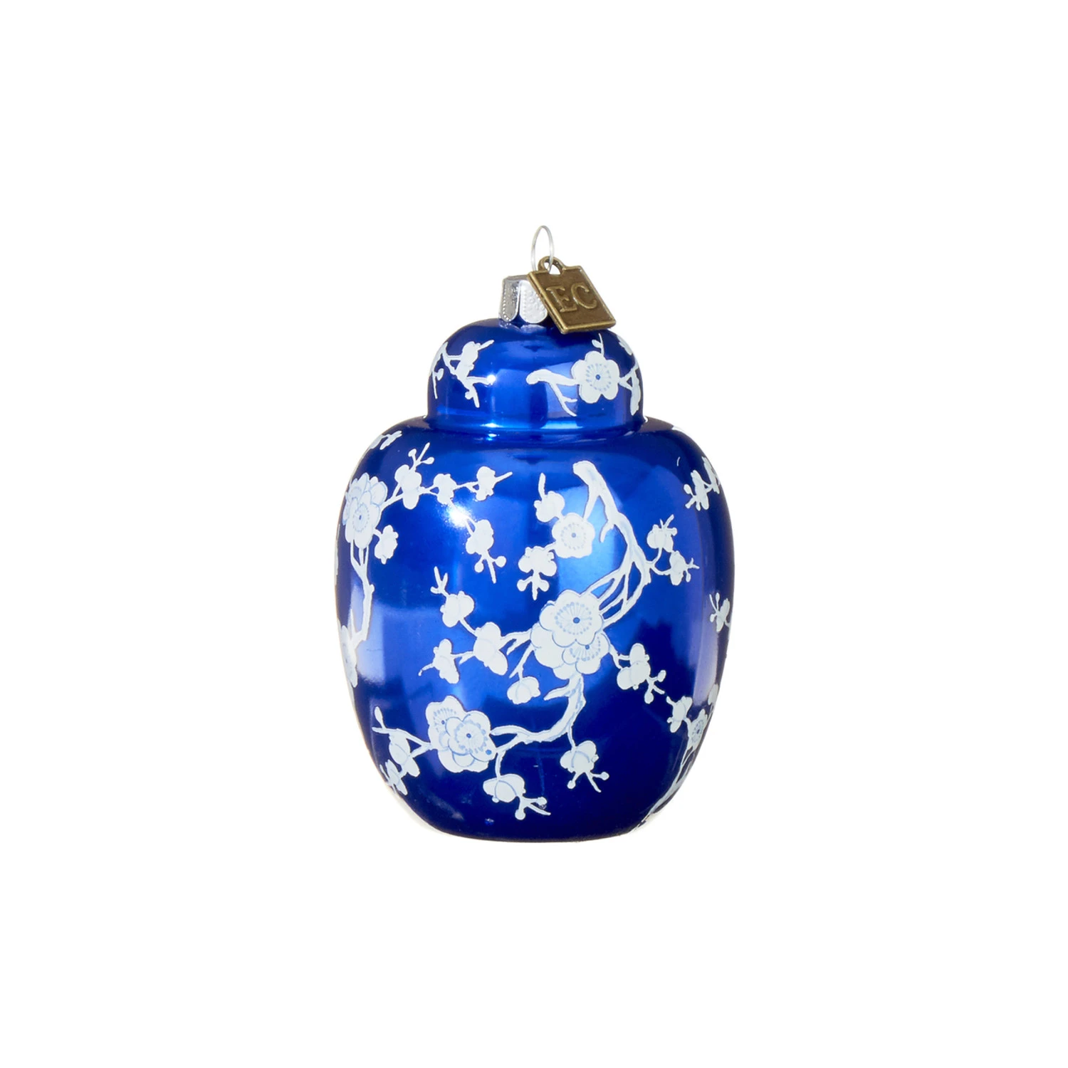 This pretty little ginger jar is the most gorgeous blue with tiny white flowers and branches drawn all over the jar. It is sure to add a pop of bright blue to your Christmas tree! Made by Eric Cortina for Raz Imports. Made of glass. Dimensions: 3″ x 2.5″. Item #: 3953035