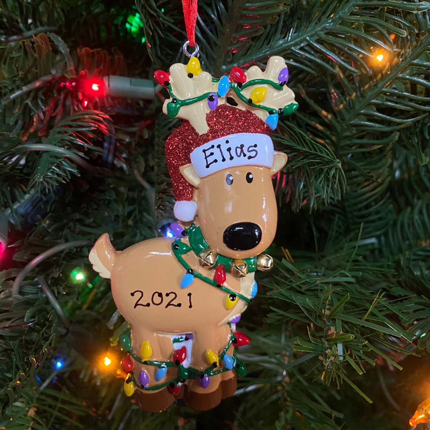 Looks like this little guy has gotten his tinsel in a tangle! This adorable ornament features a cutie reindeer wrapped up in multicolor Christmas lights! He has a hat on his head where you can write a name, and space on his belly to write the year! Made of resin. Dimensions: 2.5″ x 4.75″. Item #: OR1370
